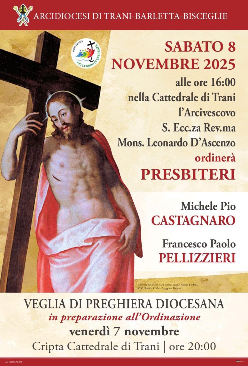 Sabato 8 novembre 2025, a Trani, nella Cattedrale, alle ore 16.00, durante una solenne celebrazione eucaristica presieduta dall’Arcivescovo mons. Leonardo D’Ascenzo, i diaconi Michele Pio Castagnaro e Francesco Paolo Pellizzieri saranno ordinati presbiteri.