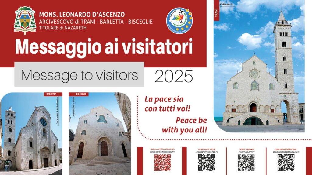 In Evidenza Sui passi di Don Pasquale: la storia prende vita al Museo Don Uva DALLA PANCIA E DAL CUORE – Incontro con l’autore Luca Russo Martedì 2 dicembre 2025 ore 19:45, Biblioteca “Il Granaio”, Parrocchia Santissima Trinità Barletta 𝐆𝐄𝐏 – 𝐆𝐢𝐨𝐫𝐧𝐚𝐭𝐞 𝐄𝐮𝐫𝐨𝐩𝐞𝐞 𝐝𝐞𝐥 𝐏𝐚𝐭𝐫𝐢𝐦𝐨𝐧𝐢𝐨 “𝑨𝒓𝒄𝒉𝒊𝒕𝒆𝒕𝒕𝒖𝒓𝒆: 𝒍❜𝒂𝒓𝒕𝒆 𝒅𝒊 𝒄𝒐𝒔𝒕𝒓𝒖𝒊𝒓𝒆” 𝐒𝐚𝐛𝐚𝐭𝐨 𝟐𝟕 𝐞 𝐝𝐨𝐦𝐞𝐧𝐢𝐜𝐚 𝟐𝟖 𝐬𝐞𝐭𝐭𝐞𝐦𝐛𝐫𝐞 - V𝐢𝐬𝐢𝐭𝐚 𝐠𝐮𝐢𝐝𝐚𝐭𝐚 alla S𝐢𝐧𝐚𝐠𝐨𝐠𝐚 𝐒𝐜𝐨𝐥𝐚 𝐆𝐫𝐚𝐧𝐝𝐞 𝐝𝐢 𝐓𝐫𝐚𝐧𝐢 A Barletta una serata dedicata a Padre Raffaele Di Bari, missionario comboniano e martire della fede DOMENICA 12 OTTOBRE IN DIOCESI LA GIORNATA DEL QUOTIDIANO “AVVENIRE” TURISMO PORTA DELL’EVANGELIZZAZIONE Roma 16- 19 Ottobre - IX Congresso Mondiale della Pastorale del Turismo - Wordl Congress on the Pastoral Care of Turism ARCHITETTURE: L’ARTE DI COSTRUIRE GIORNATE EUROPEE DEL PATRIMONIO 2025 TRANI 27 E 28 SETTEMBRE Storia e spiritualità alla scoperta della Cattedrale e del Museo diocesano di Bisceglie Inventariazione informatizzata dei beni artistici e storici. Validazione e conclusione della procedura di schedatura e catalogazione. Visite guidate alla Basilica in occasione del Giubileo 2025 BISCEGLIE - Domenica 14 settembre 2025 dall'Ufficio 3 Dicembre 2025 Sui passi di Don Pasquale: la storia prende vita al Museo Don Uva 26 Novembre 2025 DALLA PANCIA E DAL CUORE – Incontro con l’autore Luca Russo 22 Ottobre 2025 𝐆𝐄𝐏 – 𝐆𝐢𝐨𝐫𝐧𝐚𝐭𝐞 𝐄𝐮𝐫𝐨𝐩𝐞𝐞 𝐝𝐞𝐥 𝐏𝐚𝐭𝐫𝐢𝐦𝐨𝐧𝐢𝐨 “𝑨𝒓𝒄𝒉𝒊𝒕𝒆𝒕𝒕𝒖𝒓𝒆: 𝒍❜𝒂𝒓𝒕𝒆 𝒅𝒊 𝒄𝒐𝒔𝒕𝒓𝒖𝒊𝒓𝒆” 13 Ottobre 2025 A Barletta una serata dedicata a Padre Raffaele Di Bari, missionario comboniano e martire della fede Archivio "in Diocesi" Il tuo browser non supporta i frame Media Cattolici