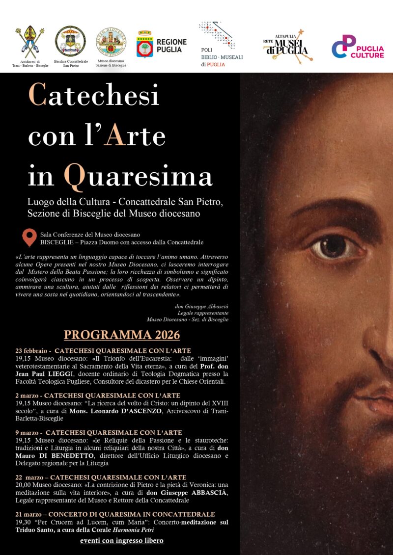 Il Luogo della Cultura Concattedrale San Pietro, Sezione di Bisceglie del Museo diocesano si prepara ad accogliere cinque eventi culturali che costituiscono un vero e proprio itinerario, in un periodo -quello quaresimale- da sempre carico di forme artistiche proprie, riflessione spirituale e teologica, pietà popolare. A partire dalle opere, in loco, i relatori introdurranno il visitatore in una Catechesi con l’arte, dialogando con l’Opera … Continua a leggere