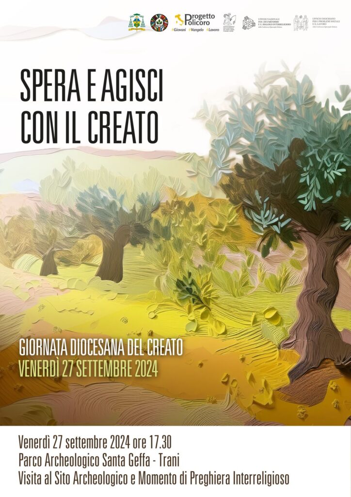 Coincidendo quest’anno la Giornata Mondiale del Turismo e la Giornata Diocesana del Creato, abbiamo ritenuto opportuno unirci all’Ufficio problemi sociali e lavoro, giustizia e pace, salvaguardia del creato e all’Ufficio per l’Ecumenismo e il dialogo Interreligioso, per vivere insieme, venerdì 27 settembre c.a., alle ore 17:30, presso il Parco archeologico S. Geffa in Trani, un momento di Preghiera Interreligioso, presieduto dall’Arcivescovo e la visita al sito.