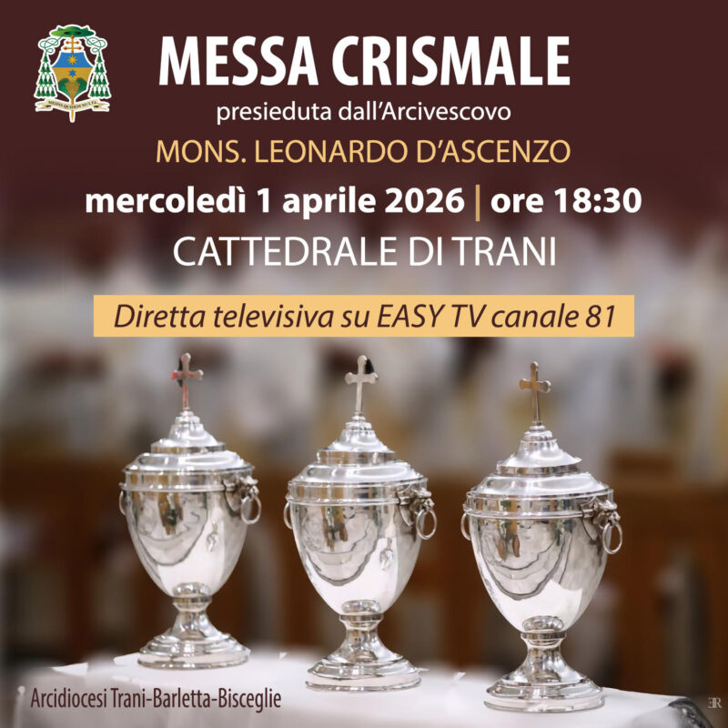 News 25 Marzo 2026 MERCOLEDI 1 APRILE, ALLE 18.30, NELLA CATTEDRALE DI TRANI, LA MESSA CRISMALE – DIRETTA TELEVISIVA SU CANALE 81