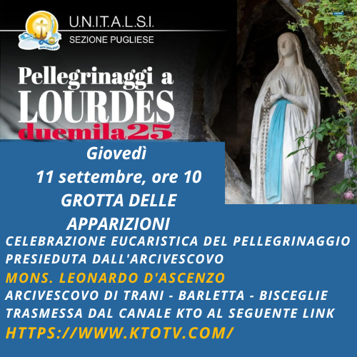Organizzato dalla sezione pugliese dell’Unitalsi, è in via di svolgimento un pellegrinaggio a Lourdes. Vi partecipano diverse sottosezioni della Puglia. La nostra diocesi vede la partecipazione delle sottosezioni di Trani e Barletta. A presiedere il pellegrinaggio l’ Arcivescovo mons. Leonardo D’Ascenzo. E sarà lui, domani 11 settembre a presiedere la santa messa che sarà celebrata nella Grotta delle Apparizioni, in diretta televisiva sull’emittente francese KTO, alle ore 10.00, al seguente link: