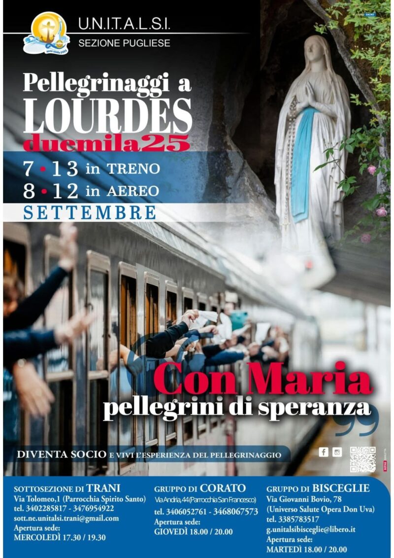 Dal 7 al 13 settembre 2025, organizzato dalla sezione pugliese dell’Unitalsi, si terrà un pellegrinaggio a Lourdes. Vi partecipano diverse sottosezioni della Puglia. La nostra diocesi vedrà la partecipazione delle sottosezioni di Trani e Barletta. Saranno guidate dal nostro Arcivescovo mons. Leonardo D’Ascenzo, che presiederà l’intero pellegrinaggio.