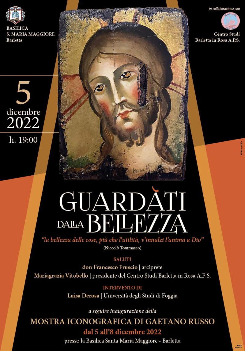 “Guardàti dalla Bellezza” Si inaugura, lunedì 5 dicembre, alle ore 19.00, nella Basilica Concattedrale di Santa Maria Maggiore in Barletta, la Mostra di icone “Guardàti dalla Bellezza”, promossa da don Francesco Fruscio, arciprete del Capitolo di Santa Maria in collaborazione con il “Centro Studi Barletta in Rosa” A.P.S. rappresentato dalla presidente prof. Mariagrazia Vitobello. In esposizione, fino all’8 dicembre, più di venti icone realizzate dal … Continua a leggere