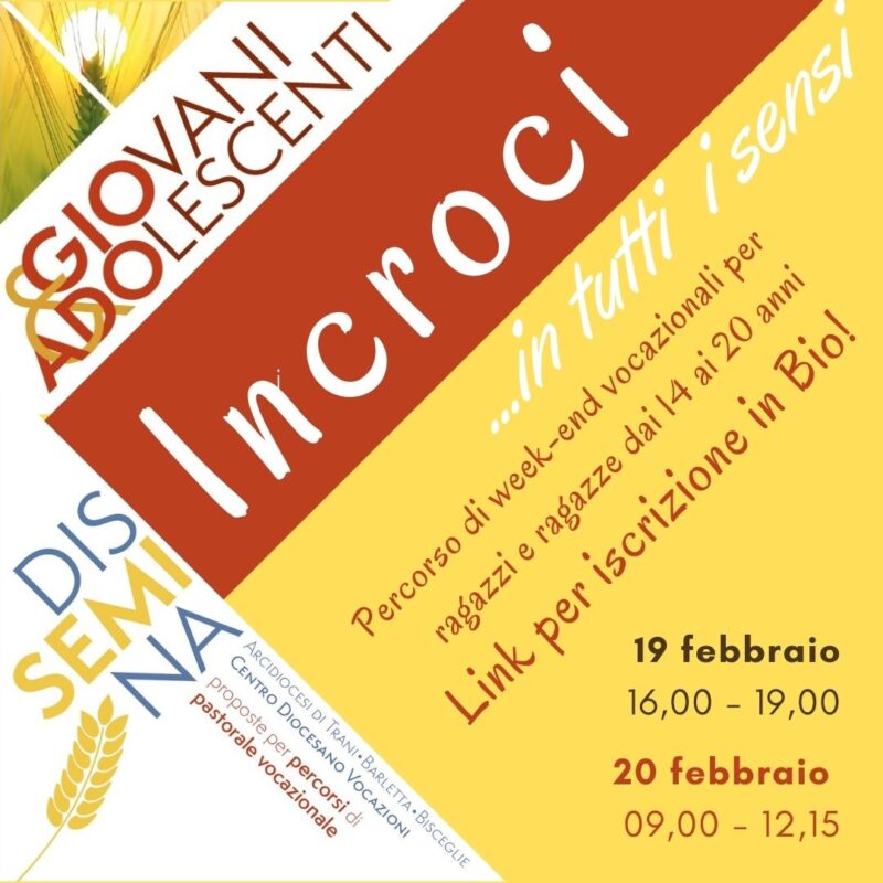 PERCORSO DI WEEK-END VOCAZIONALI PER RAGAZZI E RAGAZZE DAI 14 AI 20 ANNI “INCROCI … IN TUTTI I SENSI” E’ possibile iscriversi a questo link https://docs.google.com/forms/d/e/1FAIpQLSfcVCE8C8P4S1B9APagp25yDvDwu5bGzAkgn8B9rDmnAd8NpQ/viewform