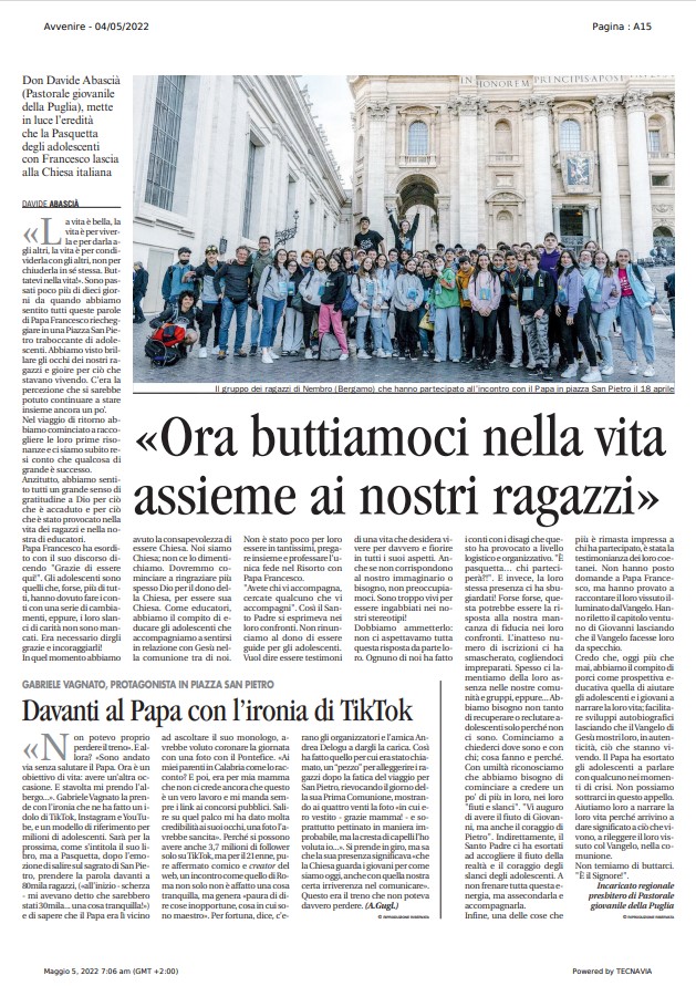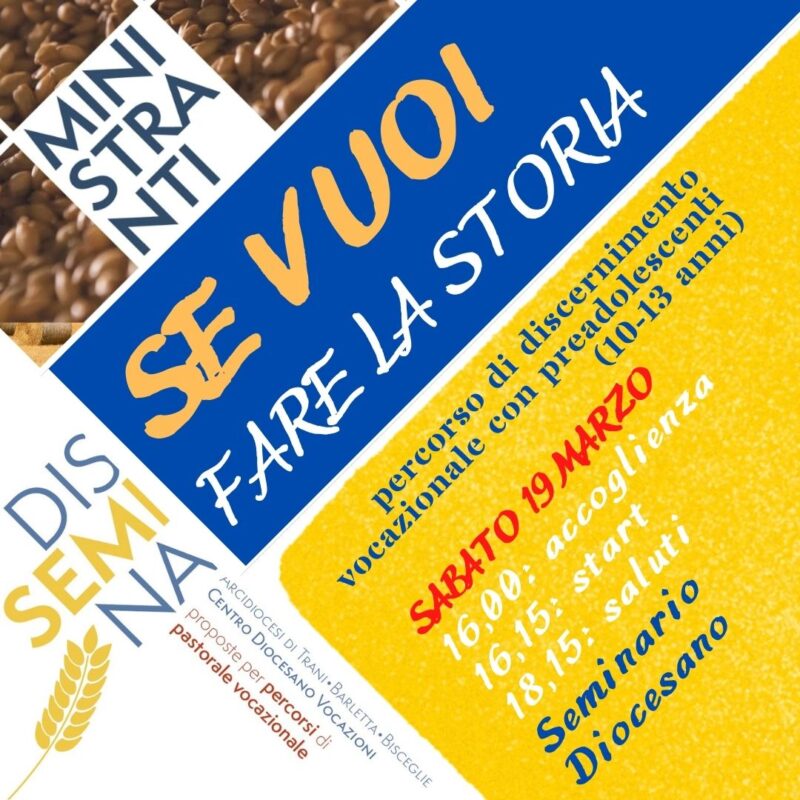 LINK PER LE ISCRIZIONI A BISCEGLIE LA 56^ GIORNATA DIOCESANA DEI MINISTRANTI Quest’anno, il 25 aprile 2022, si svolge a Bisceglie, presso il Seminario diocesano arcivescovile “don Pasquale Uva”, l’annuale appuntamento della “Giornata Diocesana dei Ministranti”, giunta alla 56^ edizione, che quest’anno dopo due anni torna ad essere vissuta in presenza. I ministranti provenienti dalle sessantacinque parrocchie delle città della nostra diocesi, Trani, Barletta, … Continua a leggere